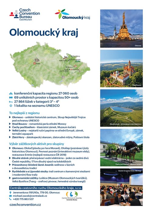 Central Moravia & Jeseniky Convention Bureau je oficiálním reprezentantem Olomouckého kraje v oblasti kongresové a incentivní turistiky. Jsme kancelář, která doporučí ideální destinaci k pořádání akcí pro korporátní klientelu, a to jak v rozmanitém regionu Střední Morava, tak i v horském prostředí Jeseníků. Olomouc je podle turistického průvodce Lonely Planet nejkrásnějším městem České republiky. Nabízíme kompletní poradenské služby pro Váš event.